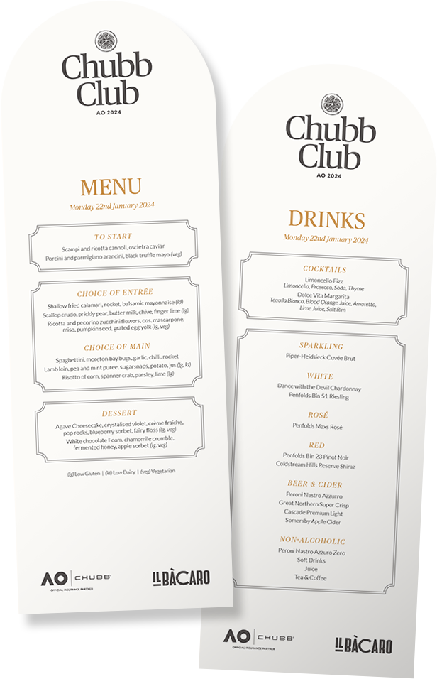 At the heart of Melbourne Park, the Chubb Club was built to provide an elevated corporate hospitality experience for Chubb Insurance’s VIP guests and clients. I was part of the team helping to conceptualise the hospitality space and created an identity for the activation, including a range of event collateral such as menus, place cards, coasters, bar signage, welcome cards and vouchers.