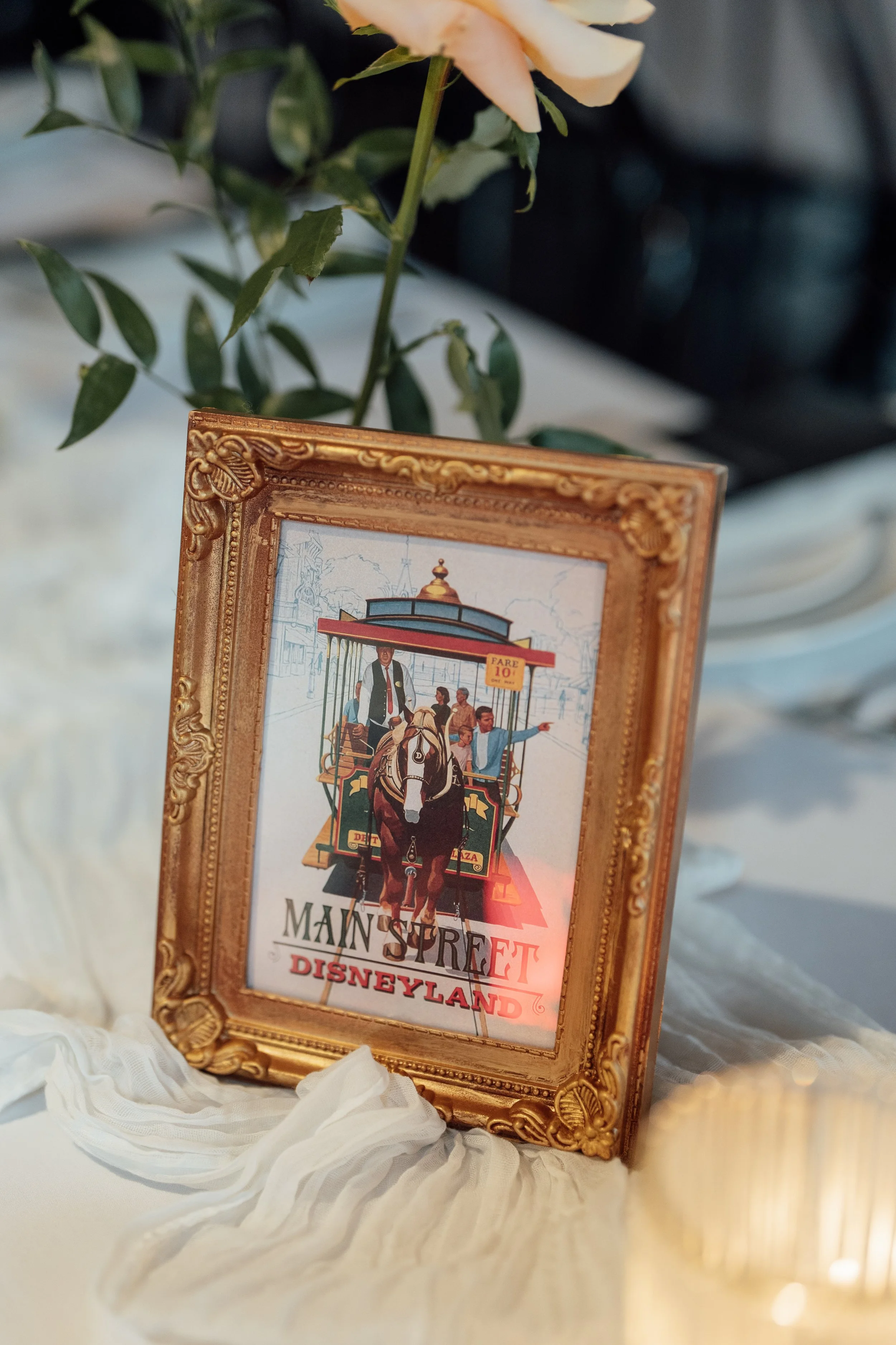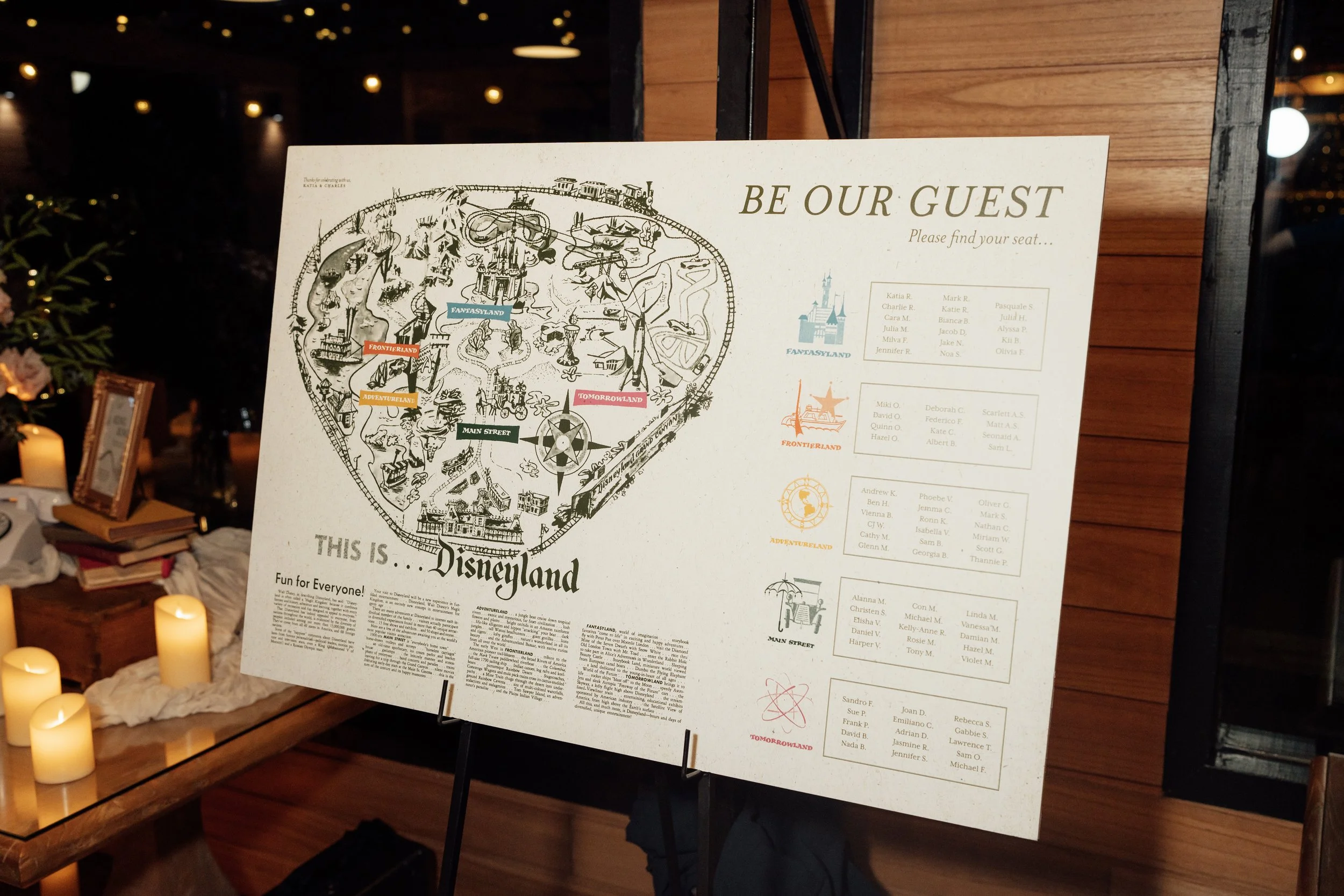 I crafted the design with a touch of Disney magic to reflect their love of the films and reference where they got engaged - at Disney World in Orlando. For the seating chart, I used the original Disney map, sourcing the original posters for each park for the table numbers. I used a range of hand-drawn illustrations to bring more of a personal touch to the signage.